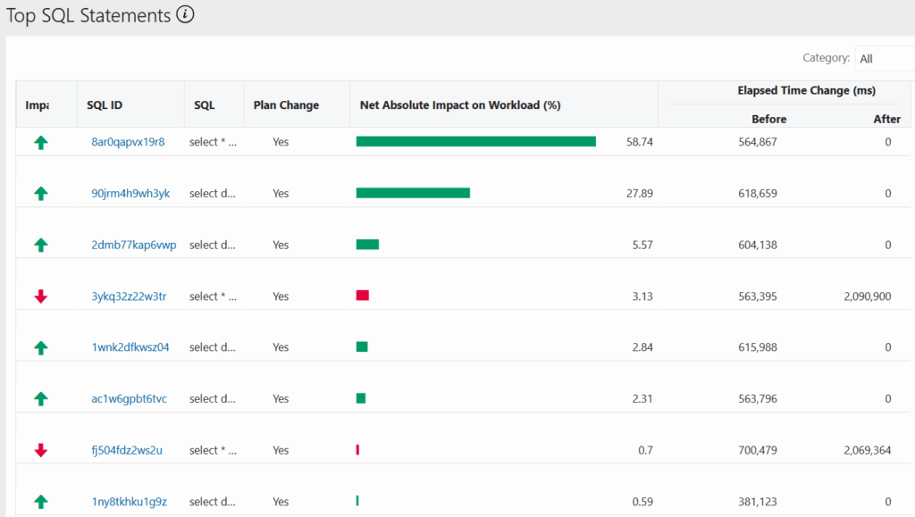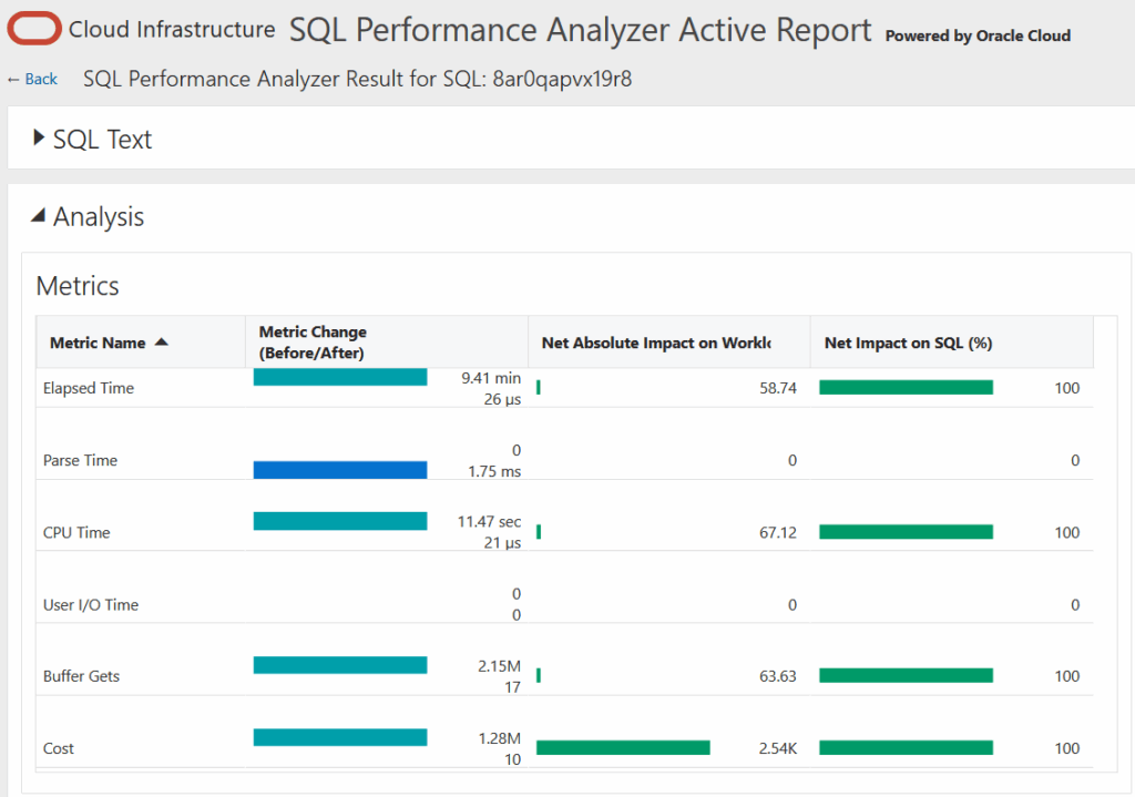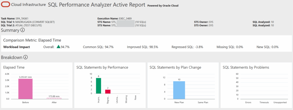 O relatório gerado pelo SQL Performance Analyzer consegue trazer uma comparação bastante clara sobre o antes e o depois das execuções dos SQLs analisados, e guiar de uma forma mais acertiva o tuning de SQLs onde a performance regrediu.