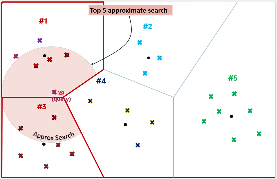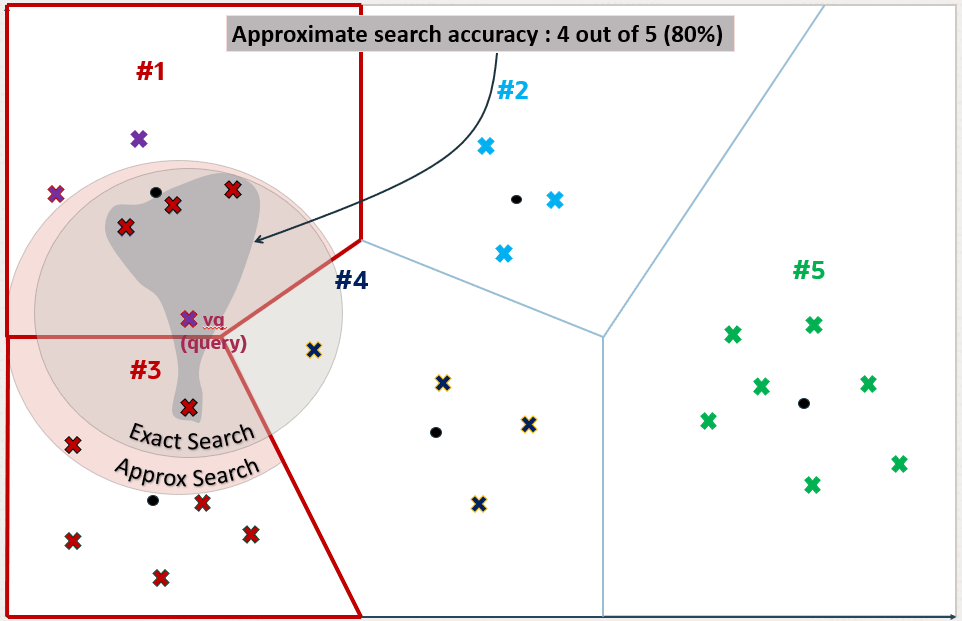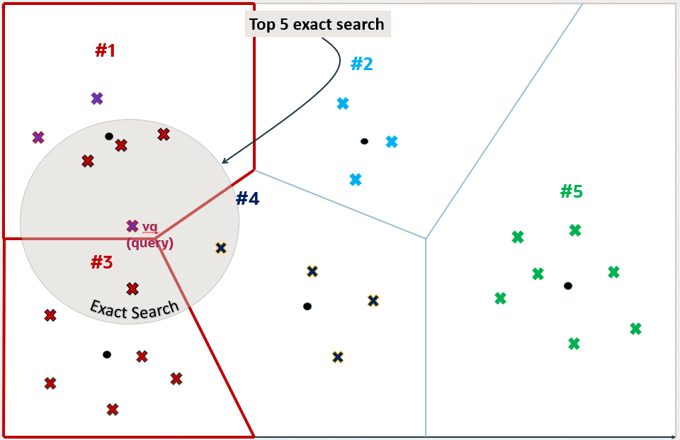 Aqui fica visível que existe um vetor na partição 4 que está entre os top-5 mais próximos em uma Exact Search: