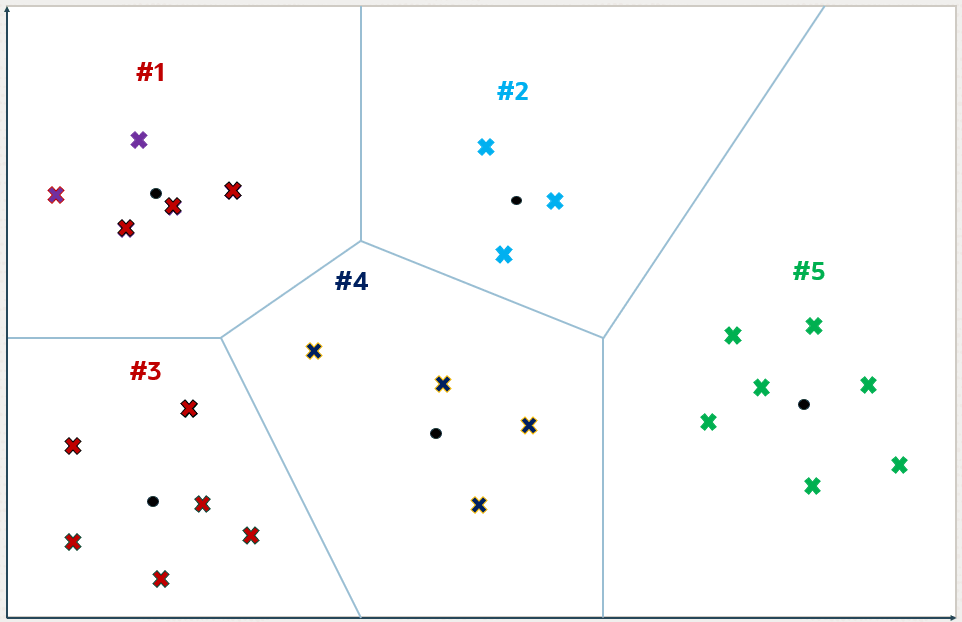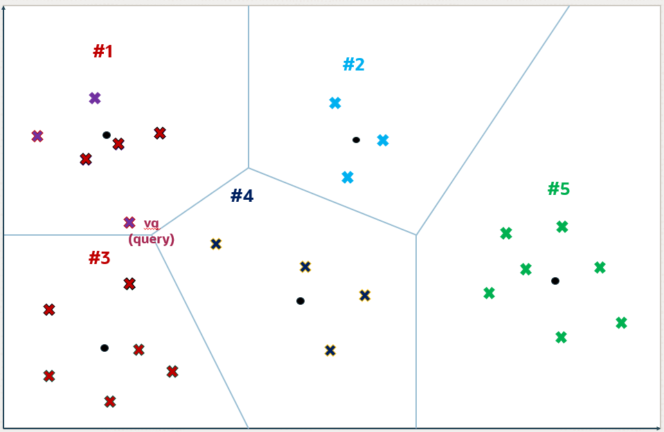 Um Inverted File Flat Index é uma técnica criada para acelerar consultas vetoriais, diminuindo a área de busca dentro do espaço vetorial. Basicamente, durante a sua criação, o espaço vetorial (o conjunto de todos os vetores da coluna indexada) é separado em clusters (partições) e um centróide é calculado para cada cluster. Esses centróides são vetores que representam o “ponto central” de cada cluster gerado. Na imagem abaixo, os vetores são representados pelo “X” e os centróides são representados pelo ponto:
