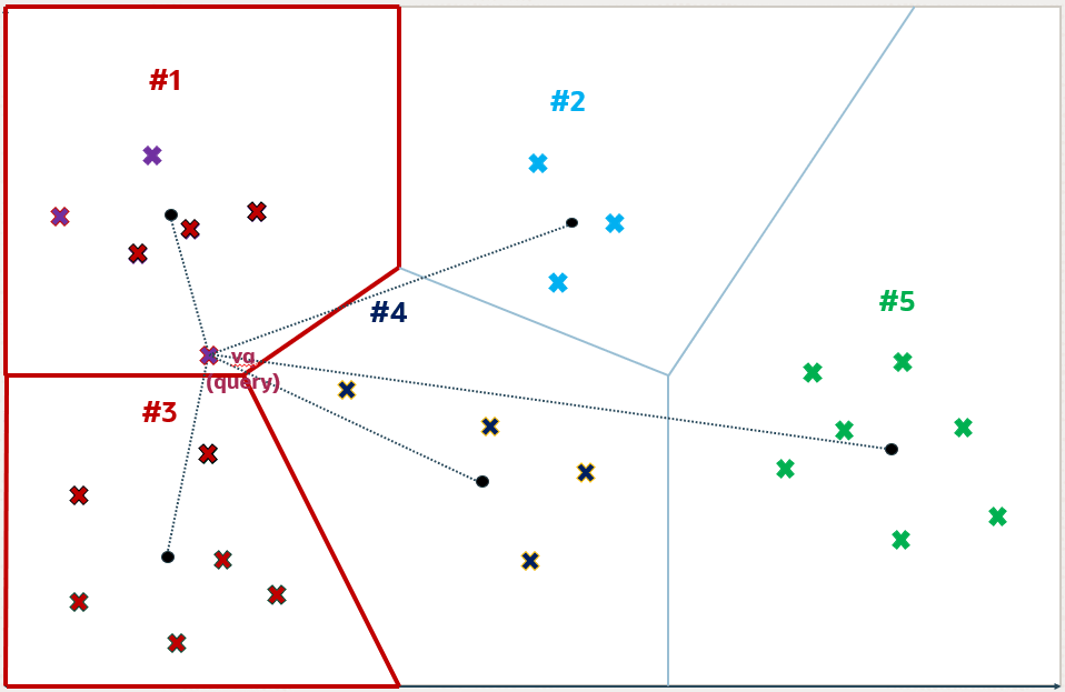 Esse vetor é enviado para o banco em uma consulta que pretende buscar os top-k vetores mais próximos. Nessa primeira fase da consulta, o banco irá calcular a distância entre o vetor passado na consulta e os centróides do índice.
